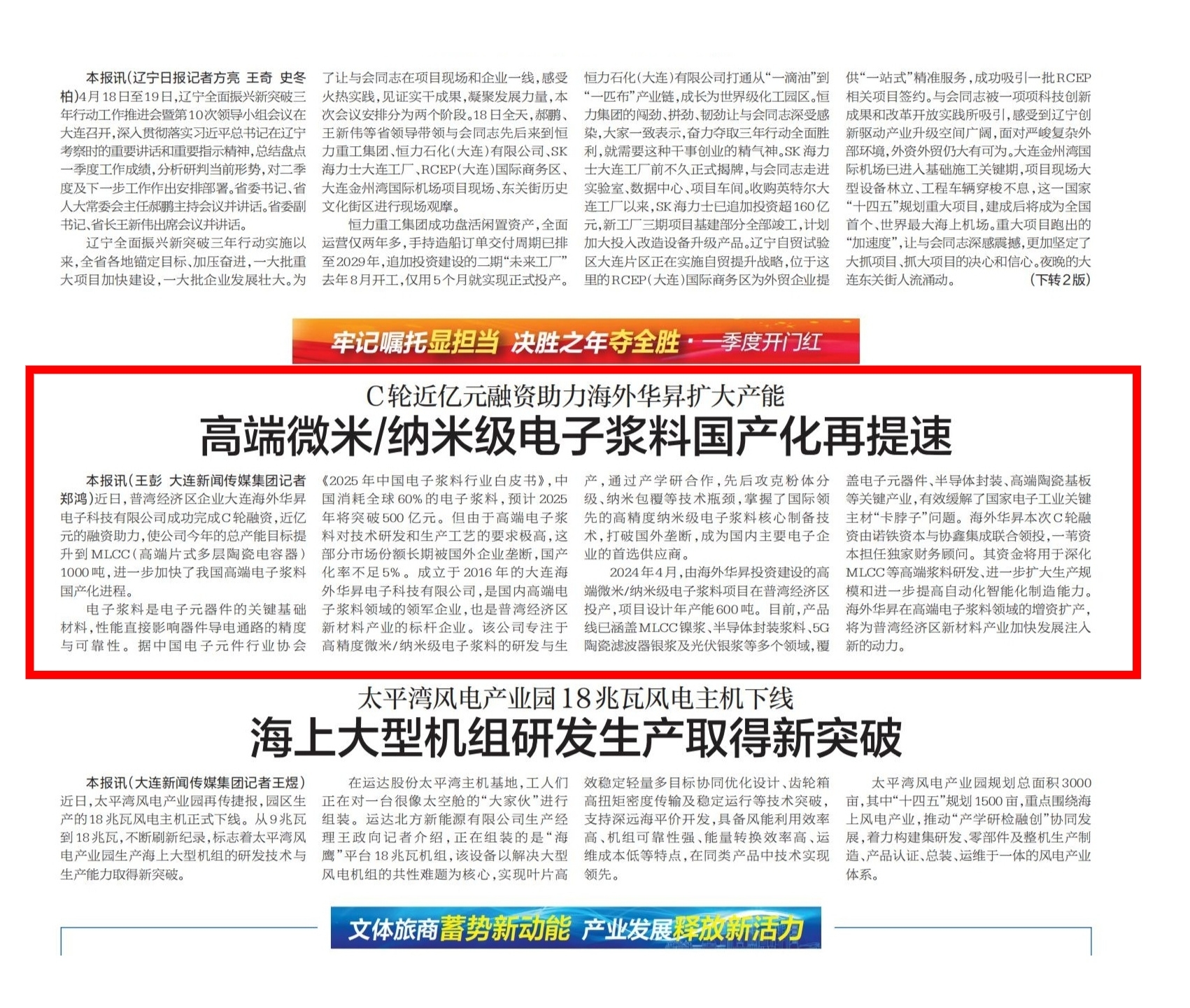 大連海外華昇電子科技有限公司(簡稱“海外華昇”)于2016年4月成立,注冊資本7940萬元,是一家專業從事高精度、微米/納米級電子漿料研發、生產和銷售的高新技術企業。目前,海外華昇已完成實際投資超2億元,建成大連總公司、無錫子公司、東莞分公司、上海子公司(上海正銀)、嘉興子公司(浙江納沛)、肇慶子公司、淮北子公司和日本子公司,擁有國際領先的電子漿料精益生產線,設備400臺(套),設計年產能1000噸,設計產值30億元。
